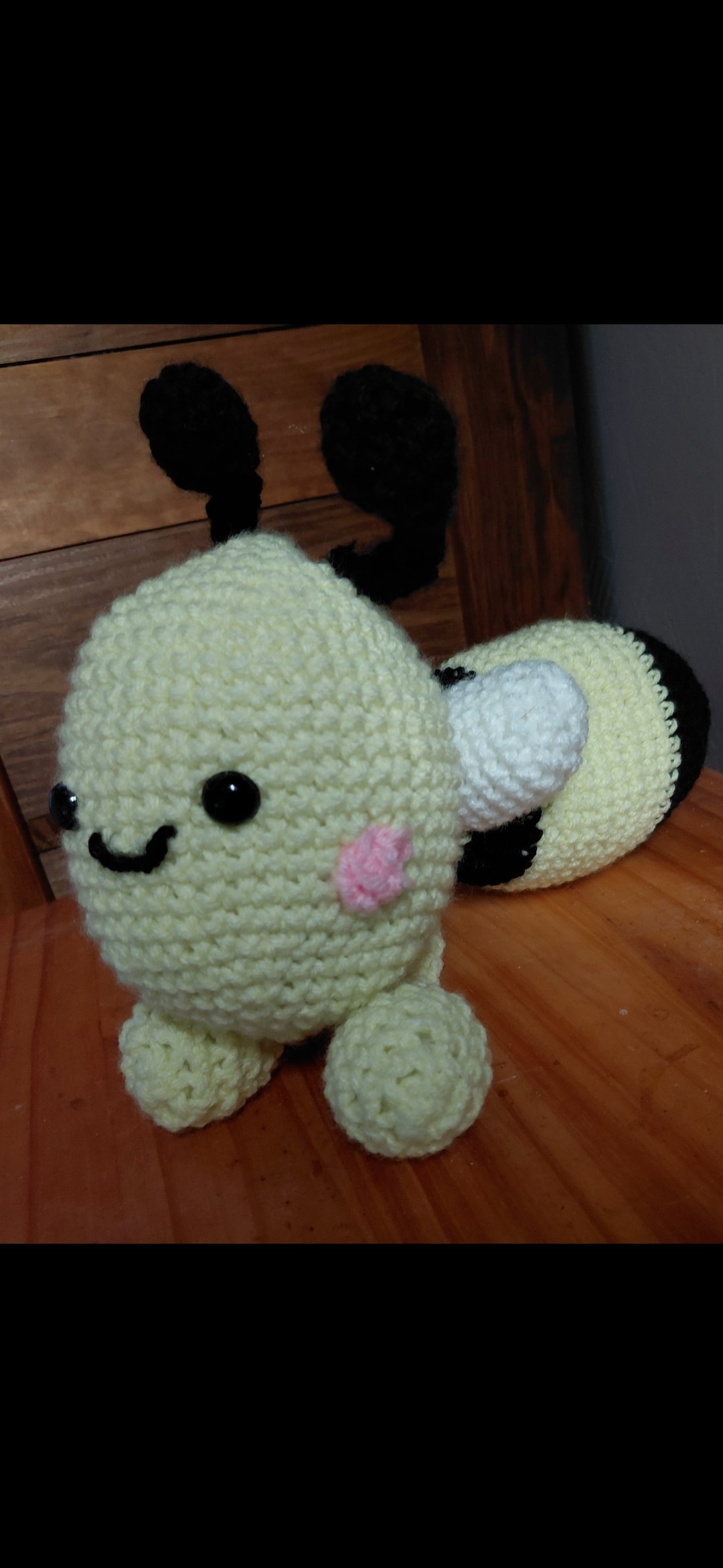 This huggable handmade crochet bumble bee is ready to be your little one’s new best friend! Standing upright on its own little feet, this amigurumi plush features soft yellow and black stripes, a white wing, adorable black antennae, shiny safety eyes, a sweet embroidered smile, and the cutest pink rosy cheek.