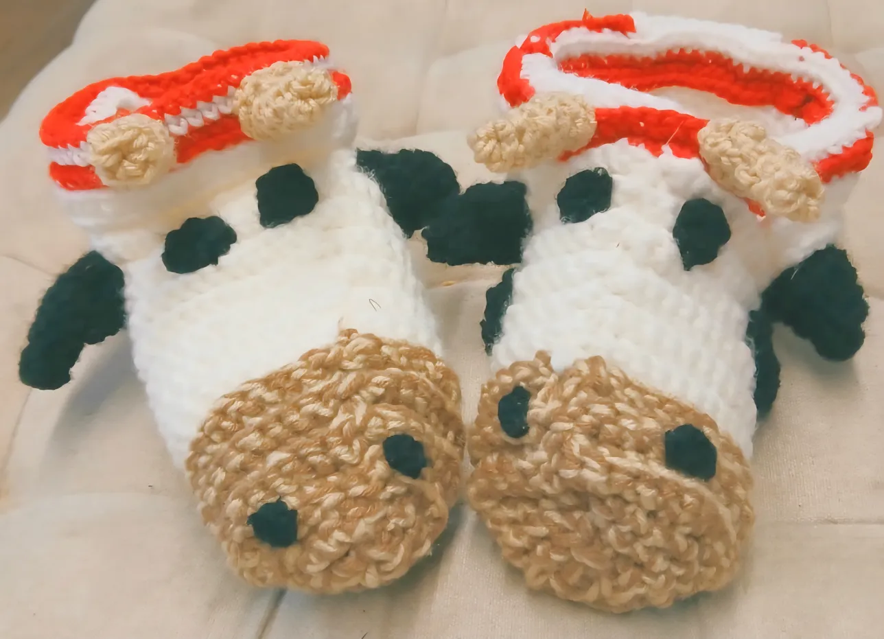 Keep your feet warm and cute with these udderly adorable cow slippers! Each pair is hand-crocheted with soft, cozy yarn and features classic black and white cow spots, a sweet tan muzzle with nostrils, tiny horns, and a red and white striped cuff for a snug fit. These take about a week to create by hand — true labor of love! Perfect for farmhouse lovers, cow collectors, or anyone who wants the coziest, cutest slippers around. Available in various sizes — contact us at hello@thehandmadehive.com for custom sizing! Handmade with love in Scottsburg, Indiana.