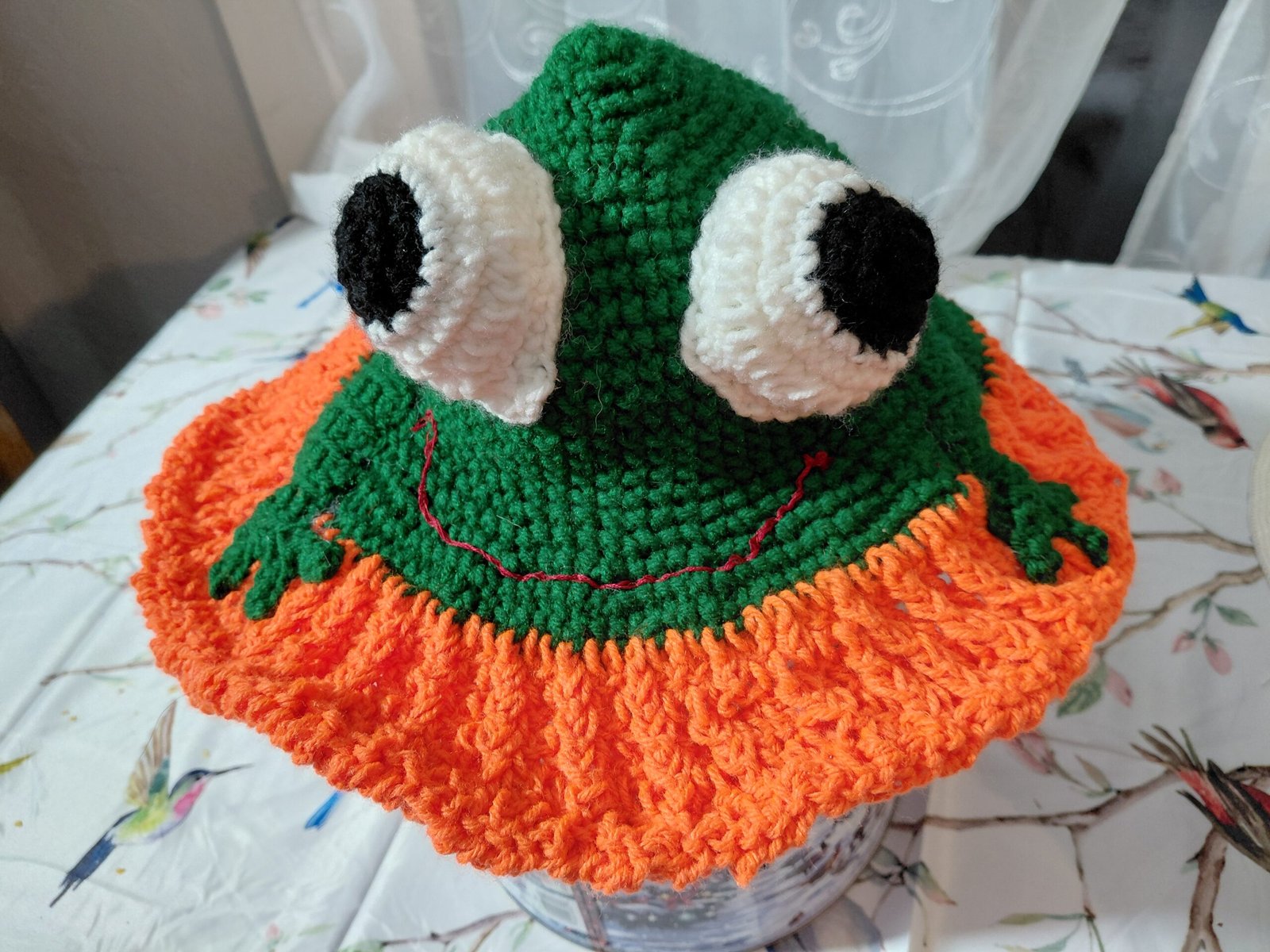 Ribbit! This adorable crochet frog bucket hat is guaranteed to make everyone smile! Featuring a bright green frog face with oversized white and black eyes, a cheerful stitched smile, and cute little frog hands peeking out from the sides. The vibrant orange ruffled brim adds a fun pop of color and keeps the sun out of your eyes.