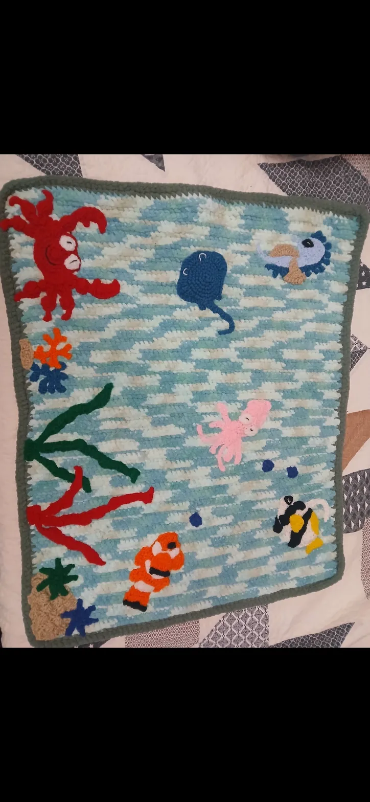 Stunning hand-crocheted designer blanket featuring a vibrant underwater scene with sea creatures. A showstopping keepsake at 2ft x 3.5ft!